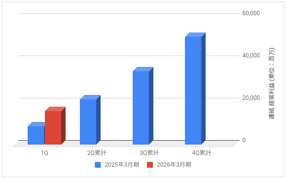 下記は2026年3月期の各決算期における連結経常利益の推移と前期との比較です。