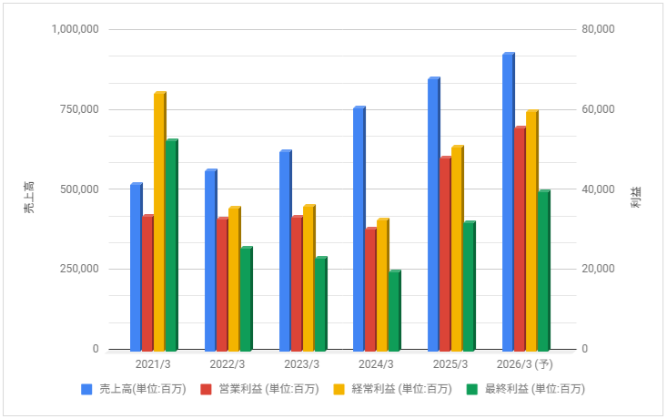2021年3月期は大きく増益となりましたが、2022年3月期、2024年3月期は減益でやや厳しめでしたが、2025年3月期は増益に。