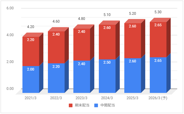 配当金は連続増配で推移しています。2026年3月期も増配予定としています。