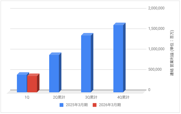 下記は2026年3月期の各決算期の連結営業利益の推移と前期との比較です。