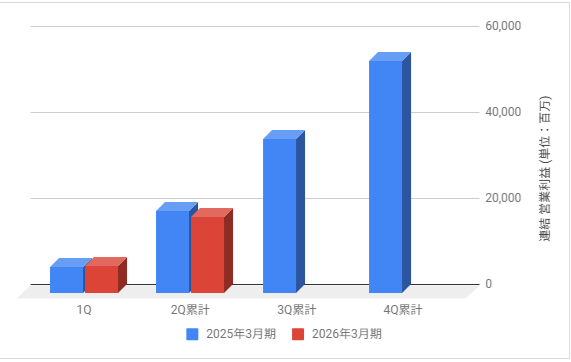 2026年3月期の各決算期における連結営業利益の推移と前期との比較です。