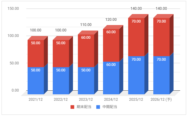 配当は年間100円で推移していましたが、2023年12月期以降は増配推移。2026年12月期は据え置き予定としています。