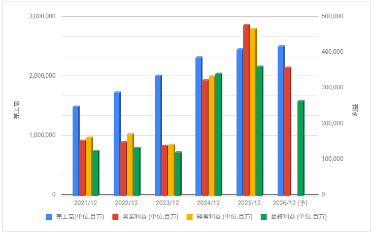 利益は減少推移していましたが、2024年12月期、2025年12月期は大きく増益に。