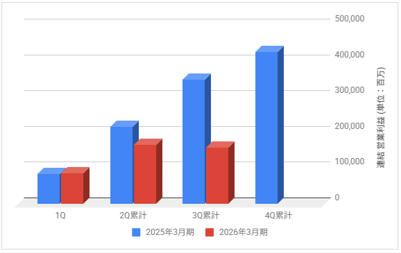 下記は2026年3月期の各決算期における連結営業利益の推移と前期との比較です。