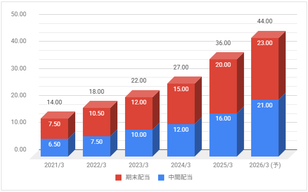 配当は増配推移です。2026年3月期も増配予定としています。