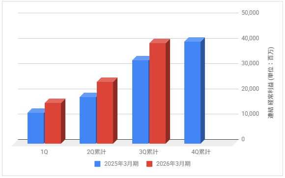 下記は2026年3月期の各決算期における連結経常利益の推移と前期との比較です。