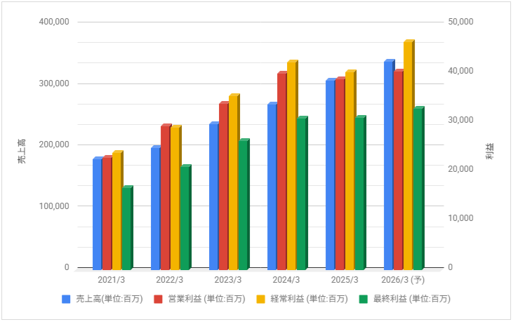 下記は売上高・営業利益・経常利益・最終利益の推移です。