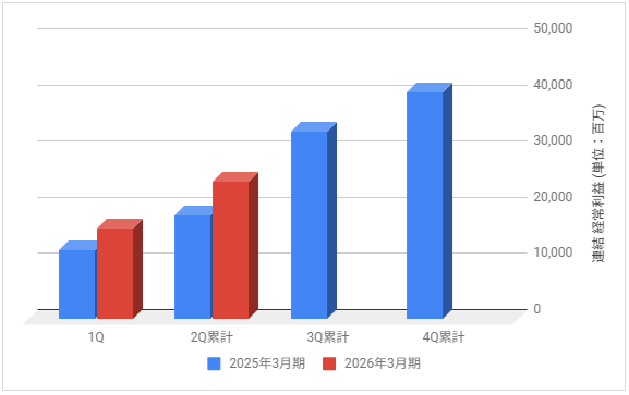 下記は2026年3月期の各決算期における連結経常利益の推移と前期との比較です。