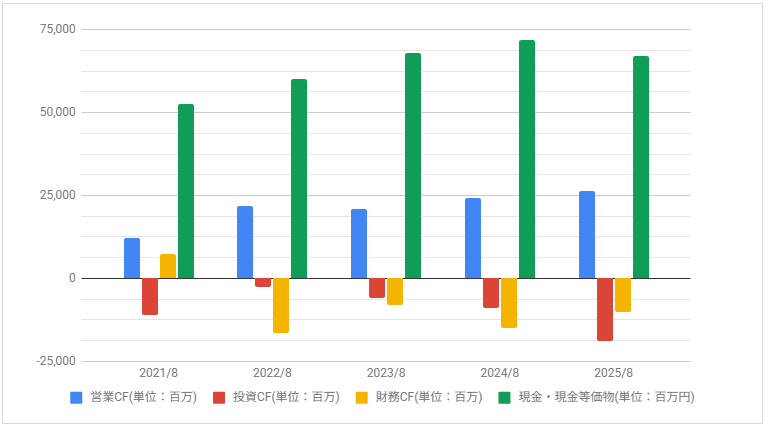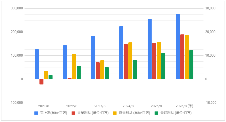 2025年8月期は増益で最高益を更新、2026年8月期は更に増益見通しとしています。