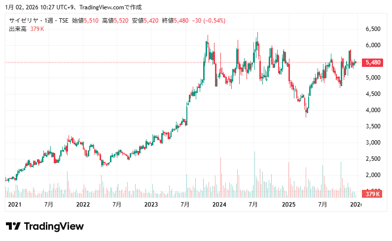 株価は2023年11月以降に大きく上昇。2024年は上昇・下落しながらレンジ推移。2025年は下落する場面も出ていますがレンジ気味の推移をしています。
