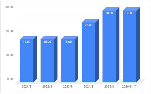 配当金は18円の据え置き推移でしたが、2024年8月期、2025年8月期は増配しています。