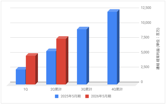下記は2026年5月期の各決算期における連結経常利益の推移と前期との比較です。