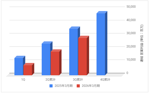 下記は2026年3月期の各決算期における連結営業利益の推移と前期との比較です。