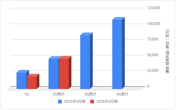 下記は2026年3月期の各決算期における連結経常利益の推移と前期との比較です。
