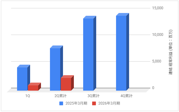 下記は2026年3月期の各決算期における連結経常利益の推移と前期との比較です。