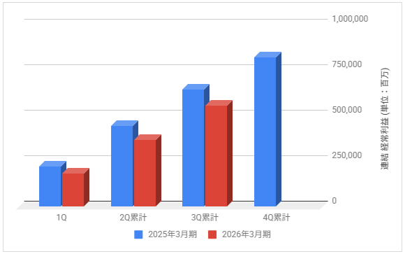2026年3月期の各決算期における連結経常利益の推移と前期との比較です。