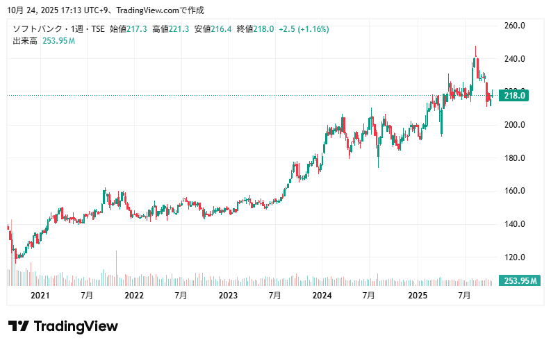 株価は2023年9月以降に上昇、2024年は上下しながらレンジで推移。2025年は上昇が強めの動きでしたが、2025年9月以降は下落場面が出ています。