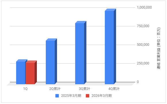 下記は2026年3月期の各決算期における連結営業利益の推移と前期との比較です。