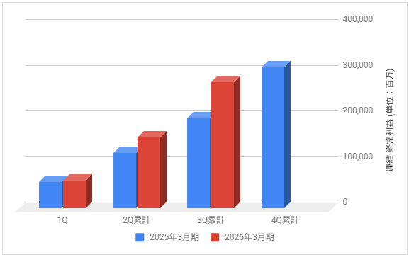 下記は2026年3月期の各決算期における連結経常利益の推移と前期との比較です。