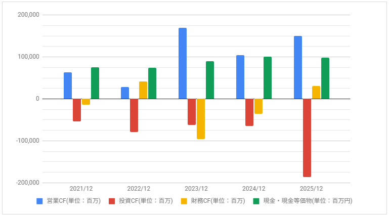 2022年12月期の営業CFは減少しましたが、2023年12月期の営業CFは大きく増えています。