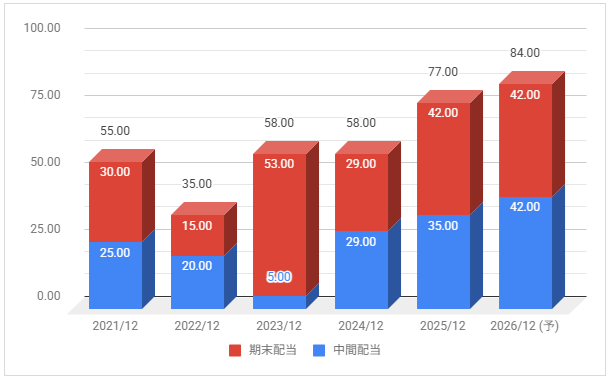 2020年12月期に減配、2021年12月期は回復しましたが2022年12月期に再び減配。2023年12月期、2025年12月期は増配、2026年12月期は増配予定としています。