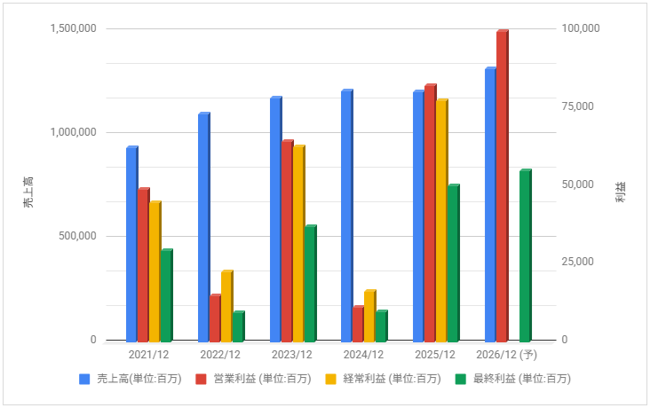 2022年12月期は大きく減益となりましたが、2023年12月期は大きく増益。2024年12月期は子会社の生産終了、解散の影響から大きく減益。2025年12月期は大きく増益に。