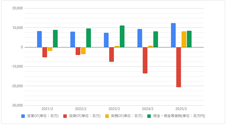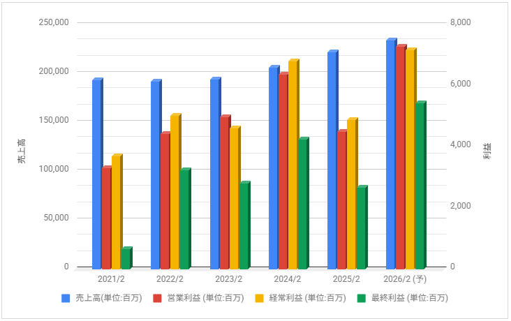 2021年の最終利益は厳しめでしたが、2022年2月期以降は比較的好調に。2024年2月期は過去最高益を更新も、2025年2月期は大きく減益に。