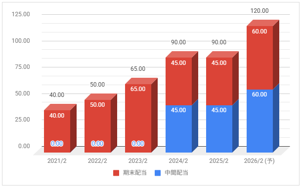 配当は増配傾向で推移。2026年2月期も増配予定としています。