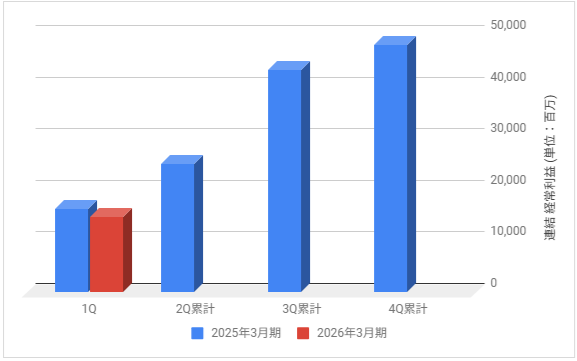 下記は2026年3月期の各決算期における連結経常利益の推移と前期との比較です。