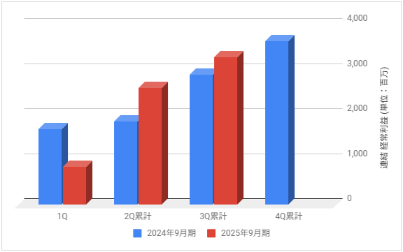 下記は2025年9月期の各決算期における連結経常利益の推移と前期との比較です。